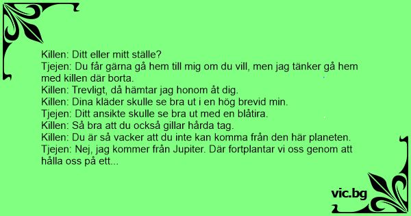 Tjejen: Nej, jag kommer från Jupiter. Där fortplantar vi oss genom att hålla oss på ett avstånd på exakt 15 meter från varandra. Hejdå!