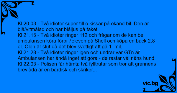 Kl 21.15 - Två idioter ringer 112 och frågar om de kan be ambulansen köra förbi 7eleven på Shell och köpa en back 2.8 or. Ölen är sluт då det blev svettigt att gå 1 mil.