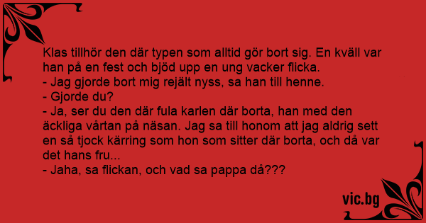 - Ja, ser du den där fula karlen där borta, han med den äckliga vårtan på näsan. Jag sa till honom att jag aldrig sett en så tjock kärring som hon som sitter där borta, och då var det hans fru...