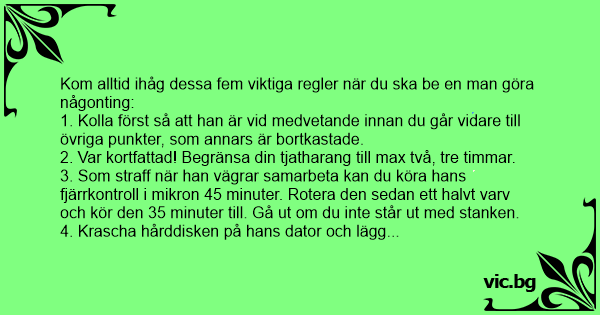 Kom alltid ihåg dessa fem viktiga regler när du ska be en man göra någonting: 1. Kolla först så att han är vid medvetande innan du går vidare till övriga punkter, som annars är bortkastade. 2. Var kortfattad! Begränsa din tjatharang till max två, tre timmar. 3. Som straff när han vägrar samarbeta kan du köra hans fjärrkontroll i mikron 45 minuter. Rotera den sedan ett halvt varv och kör den 35 minuter till. Gå ut om du inte står ut med stanken. 4. Krascha hårddisken på hans dator och lägg sportsidorna på botten av fågelburen. 5. Belöna honom för samarbetsvilligt beteende. Laga något som inte kräver att man först måste forcera en förpackning som får Kumla anstalten att framstå som öppna förskolan.