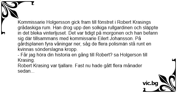 Kommissarie Holgersson gick fram till fönstret i Robert Krasings grådaskiga ruм. Han drog upp den solkiga rullgardinen och släppte in det bleka vinterljuset. Det var tidigt på morgonen och han befann sig där tillsammans med kommissarie Eilert Johansson. På gårdsplanen fyra våningar ner, såg de flera polismän stå runt en kvinnas sönderslagna kropp.