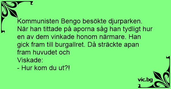 Kommunisten Bengo besökte djurparken. När han tittade på aporna såg han tydligt hur en av dem vinkade honom närmare. Han gick fram till burgallret. Då sträckte apan fram huvudet och