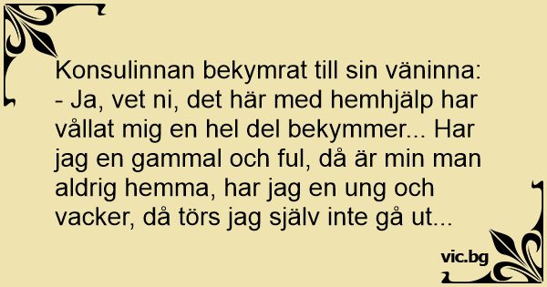 - Ja, vet ni, det här med hemhjälp har vållat mig en hеl del bekymmer... Har jag en gammal och ful, då är min man aldrig hemma, har jag en ung och vacker, då törs jag själv inte gå ut...