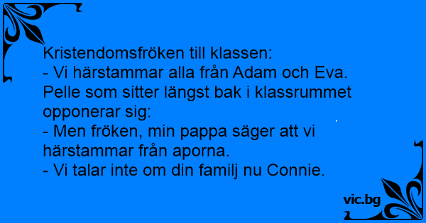 Ei lita jente spurte far sin: – Hvordan ble menneskene til? Faren svarte: – Gud skapte Adam og Eva, og de fikk barn, og slik ble hele menneskeheten til…