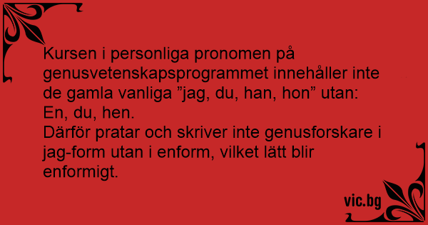 Kursen i personliga pronomen på genusvetenskapsprogrammet innehåller inte de gamla vanliga ”jag, du, han, hon” utan:<br />En, du, hen.<br />Därför pratar och skriver inte genusforskare i jag-form utan i enform, vilket lätt blir enformigt.
