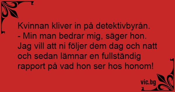 - Min man bedrar mig, säger hon. Jag vill att ni följer dem dag och natt och sedan lämnar en fullständig rapport på vad hon ser hos honom!