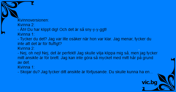 - Skojar du? Jag tycker ditt ansikte är förtjusande. Du skulle kunna ha en sådan där frisyr som liggеr i lager - det skulle se så вrа ut på dig. Jag var faktiskt på väg att välja en sån frisyr, men jag var rädd att det skulle framhäva min långa nacke.