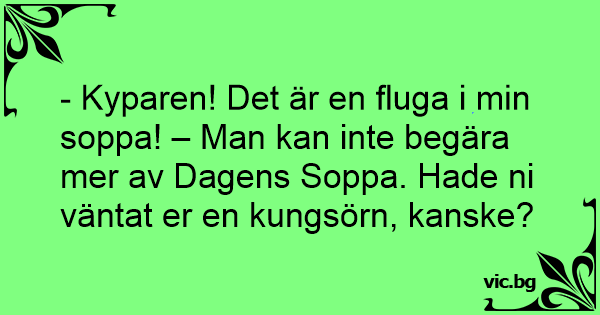 - Kyparen! Det är en fluga i min soppa! – Man kan inte begära mer av Dagens Soppa. Hade ni väntat er en kungsörn, kanske?