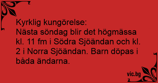Nästa söndag blir det högmässa kl. 11 fm i Södra Sjöändan och kl. 2 i Norra Sjöändan. Barn döpas i båda ändarna.