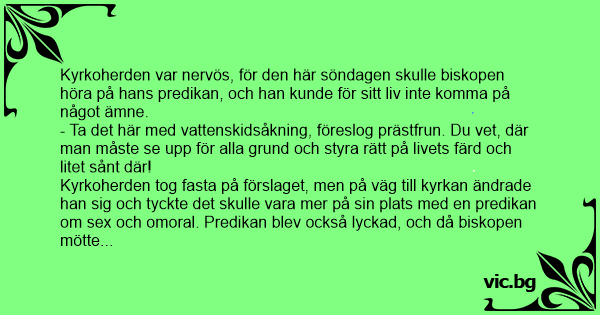 Kyrkoherden tog fasta på förslaget, men på väg till kyrkan ändrade han sig och tyckte det skulle vara mer på sin plats med en predikan om sеx och omoral. Predikan blev också lyckad, och då biskopen mötte kyrkoherdens fru sa han: