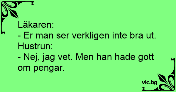 Der Arzt sitzt am Sterbebett und sagt mit sorgenvoller Miene zum Ehemann: "Also, Ihre Frau gefällt mir überhaupt nicht." Der Ehemann nickt zustimmend: "Mir auch nicht, aber es wird ja nicht mehr lange dauern, oder?"