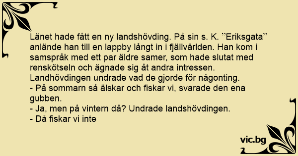 Länet hade fått en ny landshövding. På sin s. K. ”Eriksgata” anlände han till en lappby långt in i fjällvärlden. Han kom i samspråk med ett par äldre samer, som hade slutat med renskötseln och ägnade sig åt andra intressen. Landhövdingen undrade vad de gjorde för någonting.