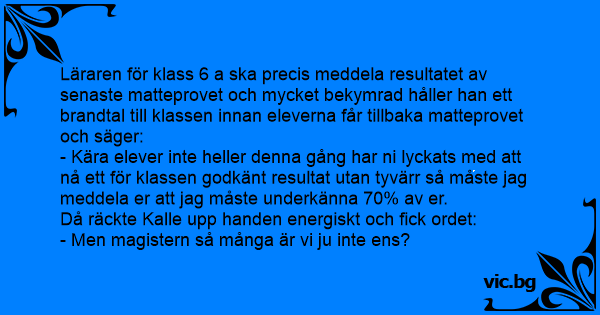 - Kära elever inte heller denna gång har ni lyckats med att nå ett för klassen godkänt resultat utan tyvärr så måste jag meddela er att jag måste underkänna 70% av er.