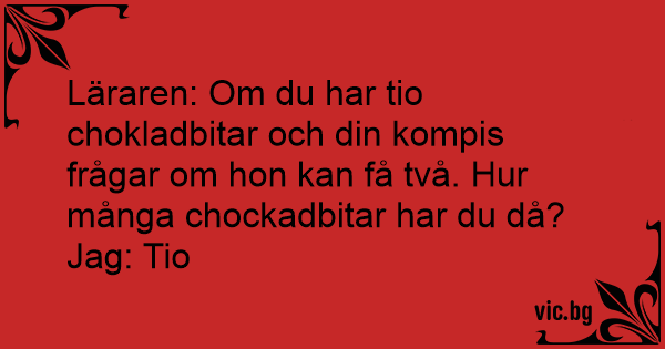 Läraren: Om du har tio chokladbitar och din kompis frågar om hon kan få två. Hur många chockadbitar har du då?
