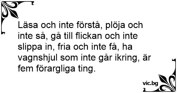 Läsa och inte förstå, plöja och inte så, gå till flickan och inte slippa in, fria och inte få, ha vagnshjul som inte går ikring, är fem förargliga ting.