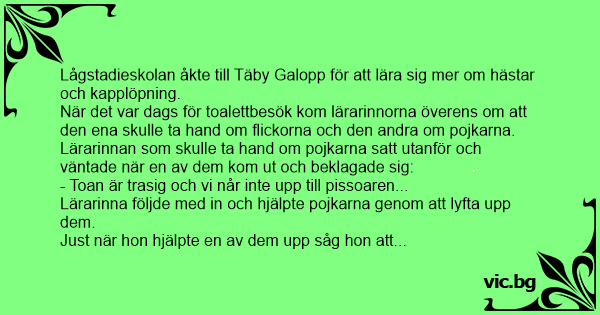 När det var dags för toalettbesök kom lärarinnorna överens om att den ena skulle ta hand om flickorna och den andra om pojkarna. Lärarinnan som skulle ta hand om pojkarna satt utanför och väntade när en av dem kom ut och beklagade sig: