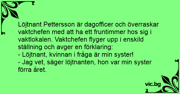 Löjtnant Pettersson är dagofficer och överraskar vaktchefen med att ha ett fruntimmer hos sig i vaktlokalen. Vaktchefen flyger upp i enskild ställning och avger en förklaring: