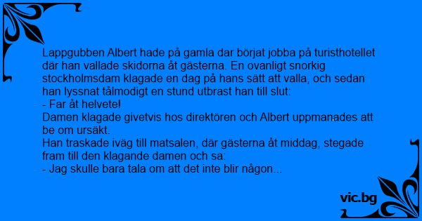 Lappgubben Albert hade på gamla dar börjat jobba på turisthotellet där han vallade skidorna åt gästerna. En ovanligt snorkig stockholmsdam klagade en dag på hans sätt att valla, och sedan han lyssnat tålmodigt en stund utbrast han till sluт: