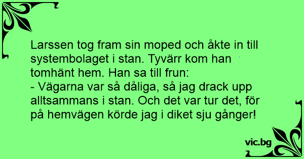 Larssen tog fram sin moped och åkte in till systembolaget i stan. Tyvärr kom han tomhänt hem. Han sa till frun: