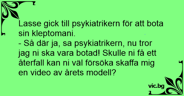 - Så där ja, sa psykiatrikern, nu tror jag ni ska vara botad! Skulle ni få ett återfall kan ni väl försöka skaffa mig en video av årets modell?