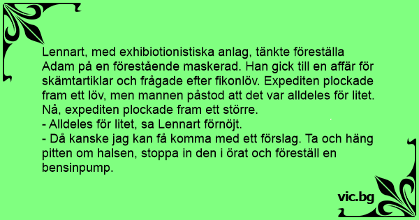 Lennart, med exhibiotionistiska anlag, tänkte föreställa Adam på en förestående maskerad. Han gick till en affär för skämtartiklar och frågade efter fikonlöv. Expediten plockade fram ett löv, men mannen påstod att det var alldeles för litet. Nå, expediten plockade fram ett större.