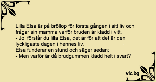- Mor? Hvorfor har bruden en hvit kjole på? Moren: - Fordi hvitt symboliserer lykke, og bryllupsdagen er den lykkeligste dagen i hennes liv. Piken: - Jammen, hvorfor har brudgommen da sort på?