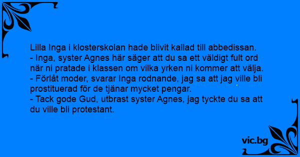 Syster Anna frågar alla i andra klass på den katolska skolan vad de vill bli när de växer upp? Lilla Lisa svarar, - När jag växt upp vill jag bli en prostituerad! Syster Annas ögon blir stora som...