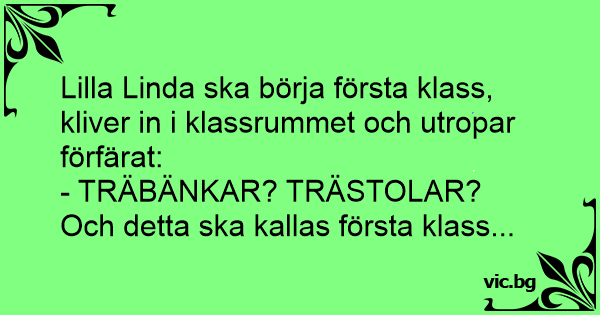 Inskickad av Martina. Tack för bidraget ;-) Lille Kalle var ny i klassen och när han kom in till klassrummet, så sa han förvånat: - Träbänkar? Men det här skulle ju vara första klass
