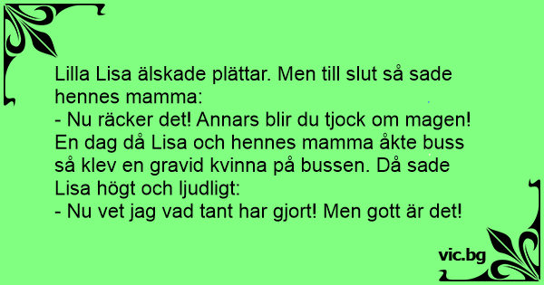 En dag då Lisa och hennes mamma åkte buss så klev en gravid kvinna på bussen. Då sade Lisa högt och ljudligt: