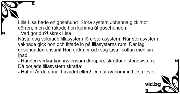 Lilla Lisa hade en gosehund. Stora systern Johanna gick mot dörren, men då råkade hon komma åt gosehunden.