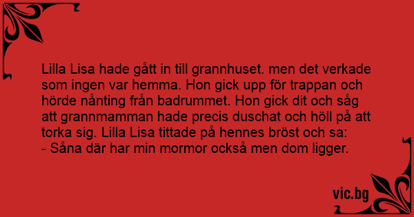 Lilla Lisa hade gått in till grannhuset. men det verkade som ingen var hemma. Hon gick upp för trappan och hörde nånting från badrummet. Hon gick dit och såg att grannmamman hade precis duschat och höll på att torka sig. Lilla Lisa tittade på hennes bröst och sa: