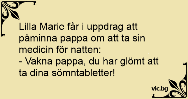 Rikard kom in till sin pappa och sa: - Pappa, pappa, vakna... Pappan vaknade och sa: - Öh,vad är det? - Du glömde ta dina sömntabletter...