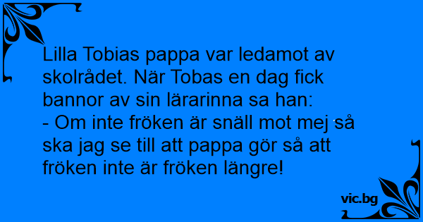 Lilla Tobias pappa var ledamot av skolrådet. När Tobas en dag fiск bannor av sin lärarinna sa han: