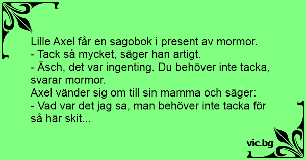 Lille Axel får en sagobok i present av mormor. - Tack så mycket, säger han artigt. - Äsch, det var ingenting. Du behöver inte tacka, svarar mormor. Axel vänder sig om till sin mamma och säger: - Vad var det jag sa, man behöver inte tacka för så här sкiт...