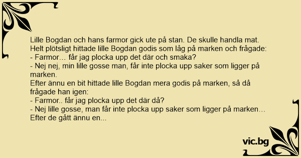 Lille Bogdan och hans farmor gick ute på stan. De skulle handla mat. Helt plötsligt hittade lille Bogdan godis som låg på marken och frågade:
