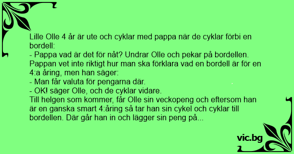 Till helgen som kommer, får Olle sin veckopeng och eftersom han är en ganska smart 4:åring så tar han sin cykel och cyklar till bordellen. Där går han in och lägger sin peng på bordet och säger: