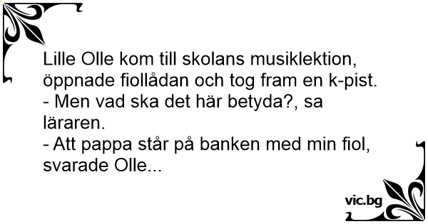Eleven till musikläraren. - Varför har du med en k-pist till musiklektionen? - Fan! Då har farsan fått med sig fiolen till bankrånet!