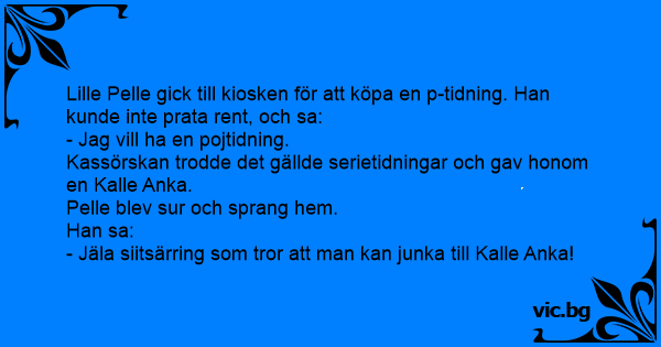 Lille Pelle gick till kiosken för att köpa en p-tidning. Han kunde inte prata rent, och sa: