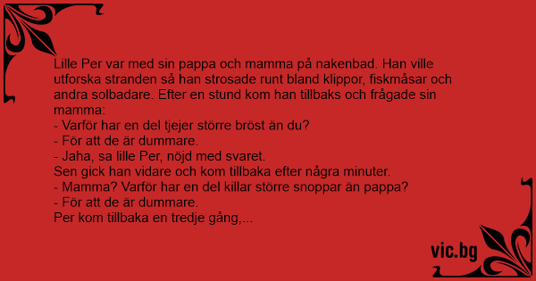 Lille Per var med sin pappa och mamma på nakenbad. Han ville utforska stranden så han strosade runt bland klippor, fiskmåsar och andra solbadare. Efter en stund kom han tillbaks och frågade sin mamma: