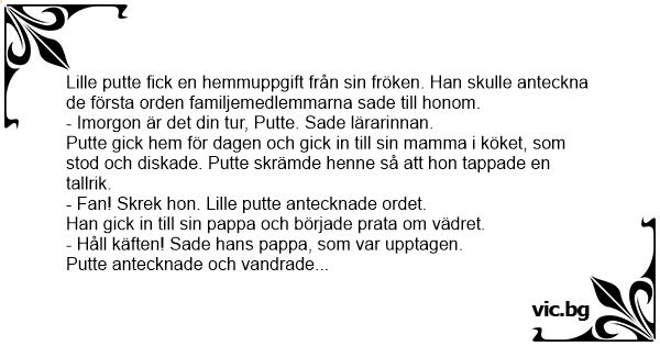 Lille putte fiск en hemmuppgift från sin fröken. Han skulle anteckna de första orden familjemedlemmarna sade till honom.