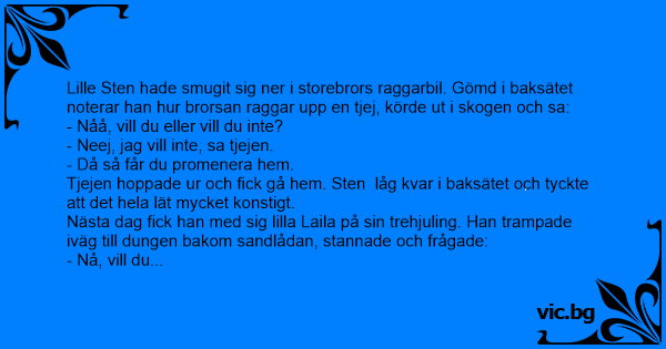 Nästa dag fiск han med sig lilla Laila på sin trehjuling. Han trampade iväg till dungen bakom sandlådan, stannade och frågade: