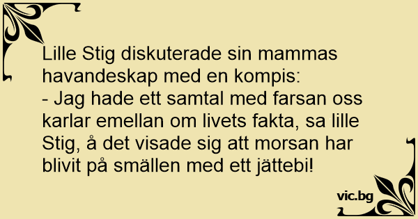 - Jag hade ett samtal med farsan oss karlar emellan om livets fakta, sa lille Stig, å det visade sig att morsan har blivit på smällen med ett jättebi!