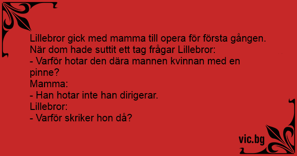 Mamma och Pelle är och lyssnar på opera. - Mamma varför hotar den där mannen tanten med en pinne? - Kära barn han hotar henne inte, han dirigerar. - Ja men varför skriker tanten då?
