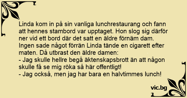 Linda kom in på sin vanliga lunchrestaurang och fann att hennes stambord var upptaget. Hon slog sig därför ner vid ett bord där det satt en äldre förnäm dam. Ingen sade något förrän Linda tände en cigarett efter maten. Då utbrast den äldre damen: