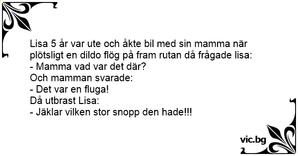 Lisa 5 år var ute och åkte bil med sin mamma när plötsligt en dildо flög på fram rutan då frågade lisa: