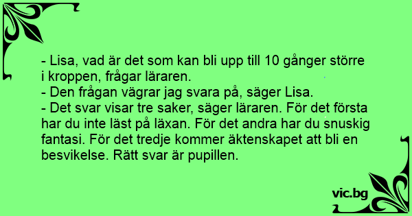 - Det svar visar tre saker, säger läraren. För det första har du inte läst på läxan. För det andra har du snuskig fantasi. För det tredje kommer äktenskapet att bli en besvikelse. Rätt svar är pupillen.