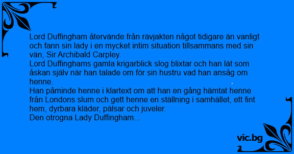 Lord Duffingham återvände från rävjakten något tidigare än vanligt och fann sin lady i en mycket intim situation tillsammans med sin vän, Sir Archibald Carpley. Lord Duffinghams gamla krigarblick slog blixtar och han lät som åskan själv när han talade om för sin hustru vad han ansåg om henne. Han påminde henne i klartext om att han en gång hämtat henne från Londons slum och gett henne en ställning i samhället, ett fint hem, dyrbara kläder, pälsar och juveler. Den otrogna Lady Duffingham blev helt ifrån sig av gråt och den upprörde lorden vände då istället sin vrede mot sin vän Sir Archiblad Carpley. - Och vad dej beträffar, Carpley: Du kan väl åtminstone sluta upp när jag talar till dej!