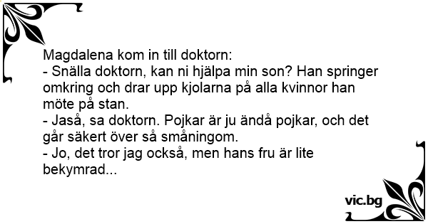 - Snälla doktorn, kan ni hjälpa min son? Han springer omkring och drar upp kjolarna på alla kvinnor han möte på stan.