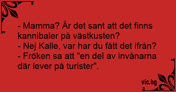 - Mamma, finns det kannibaler i Jämtland? - Nej, varför undrar du det? - Pappa sa att de lever på turister...