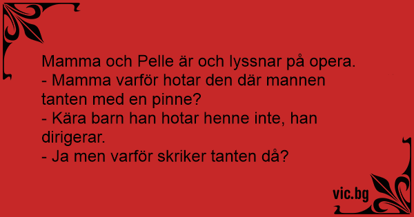 Lillebror gick med mamma till opera för första gången. När dom hade suttit ett tag frågar Lillebror: - Varför hotar den dära mannen kvinnan med en pinne? Mamma: - Han hotar inte han dirigerar. Lillebror: - Varför skriker hon då?